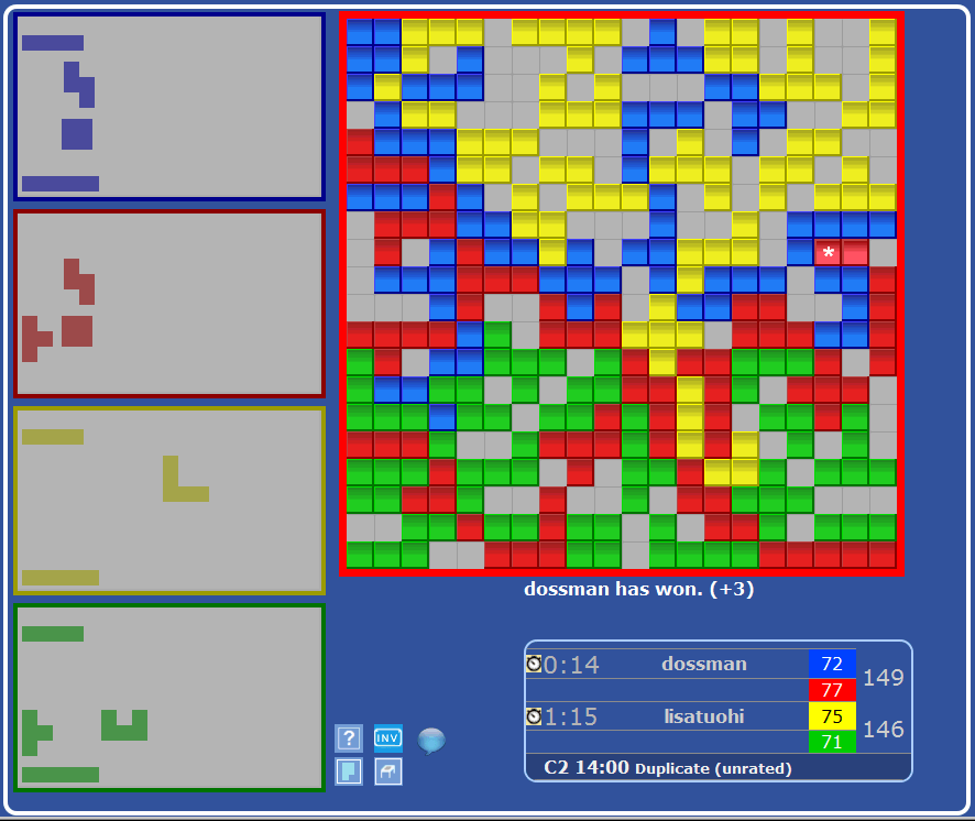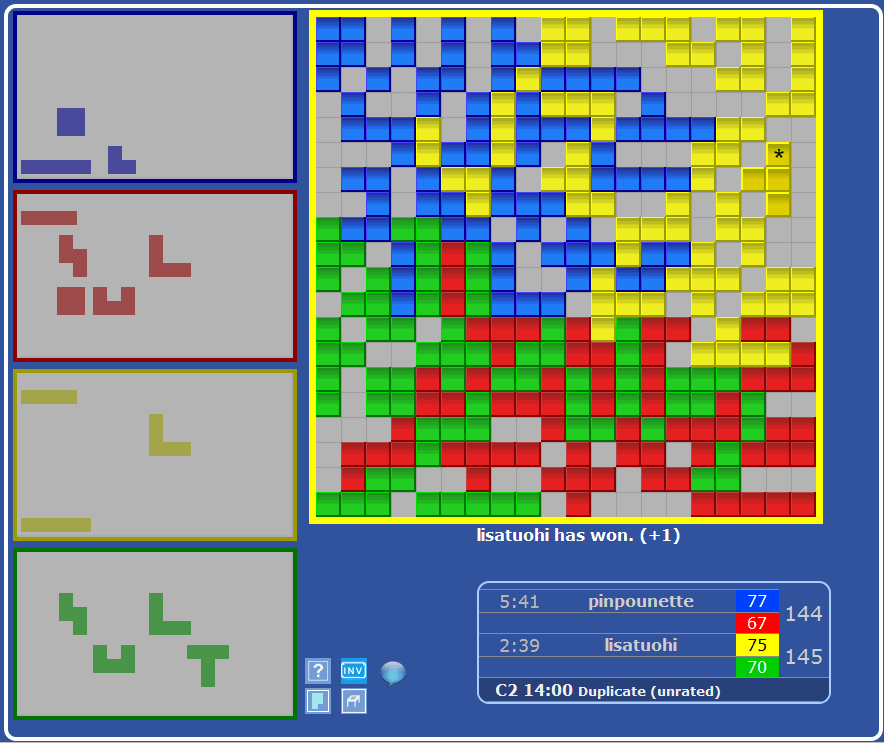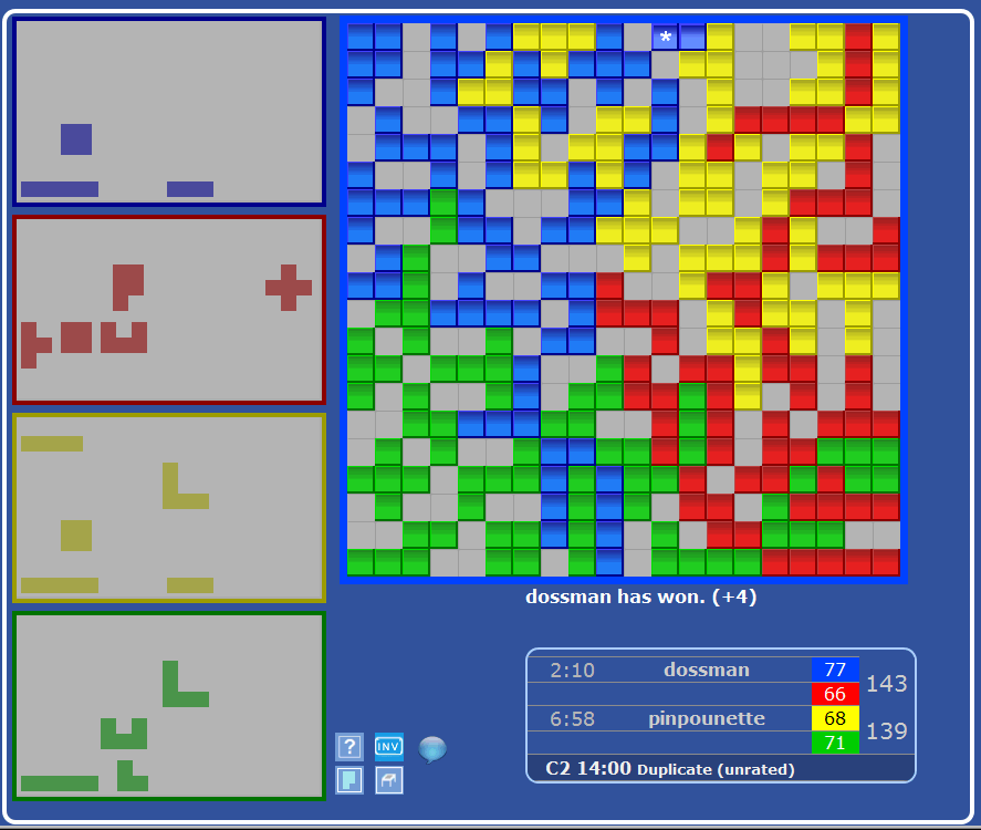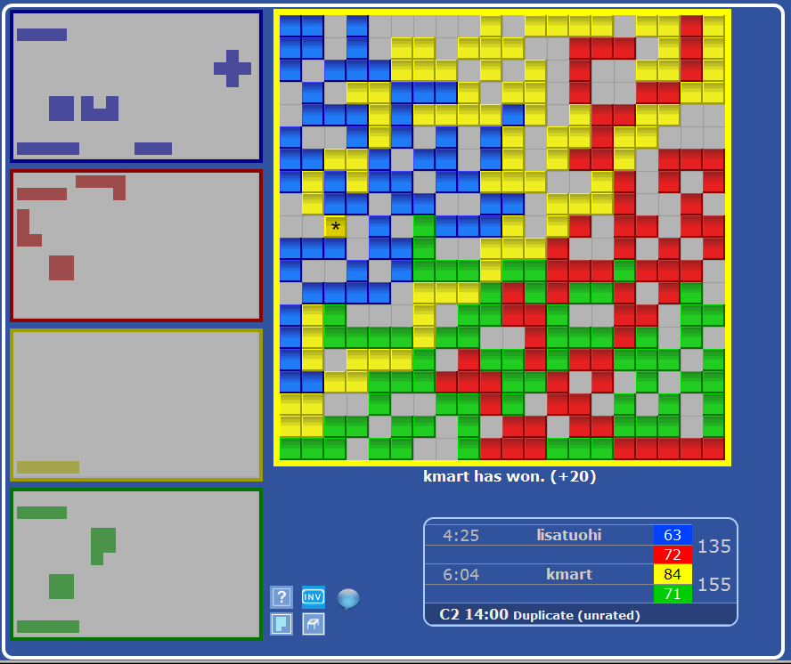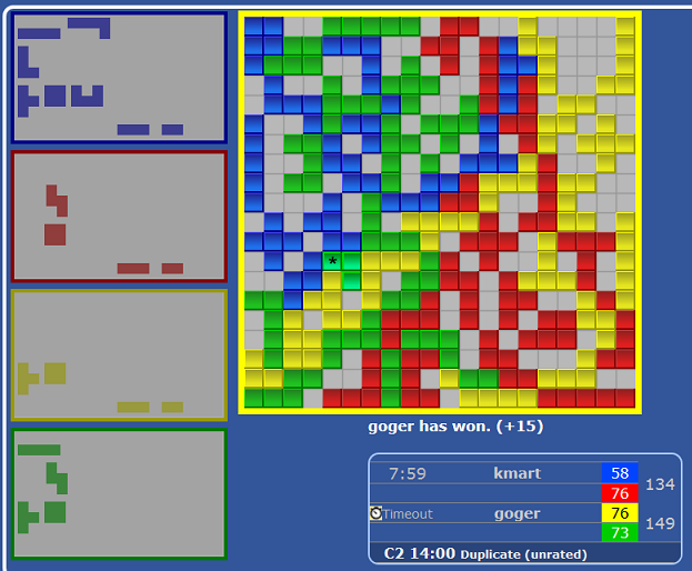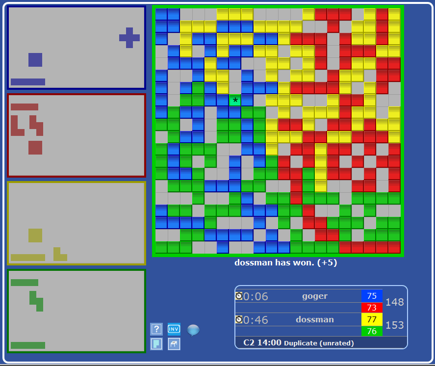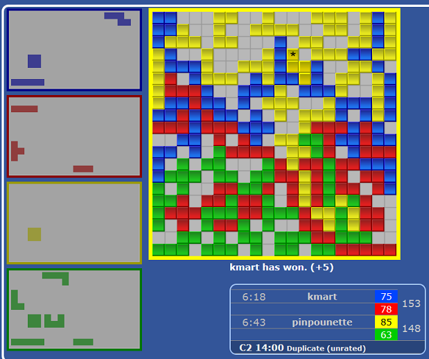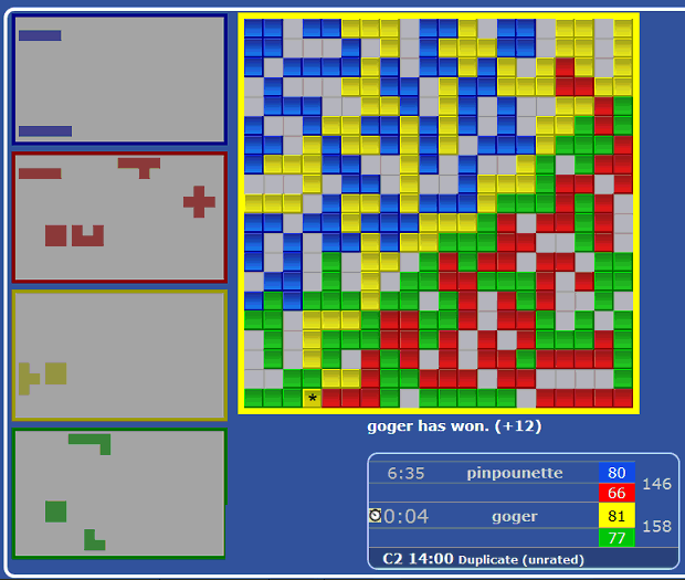 Blue won 4 of the games, Yellow won 8,